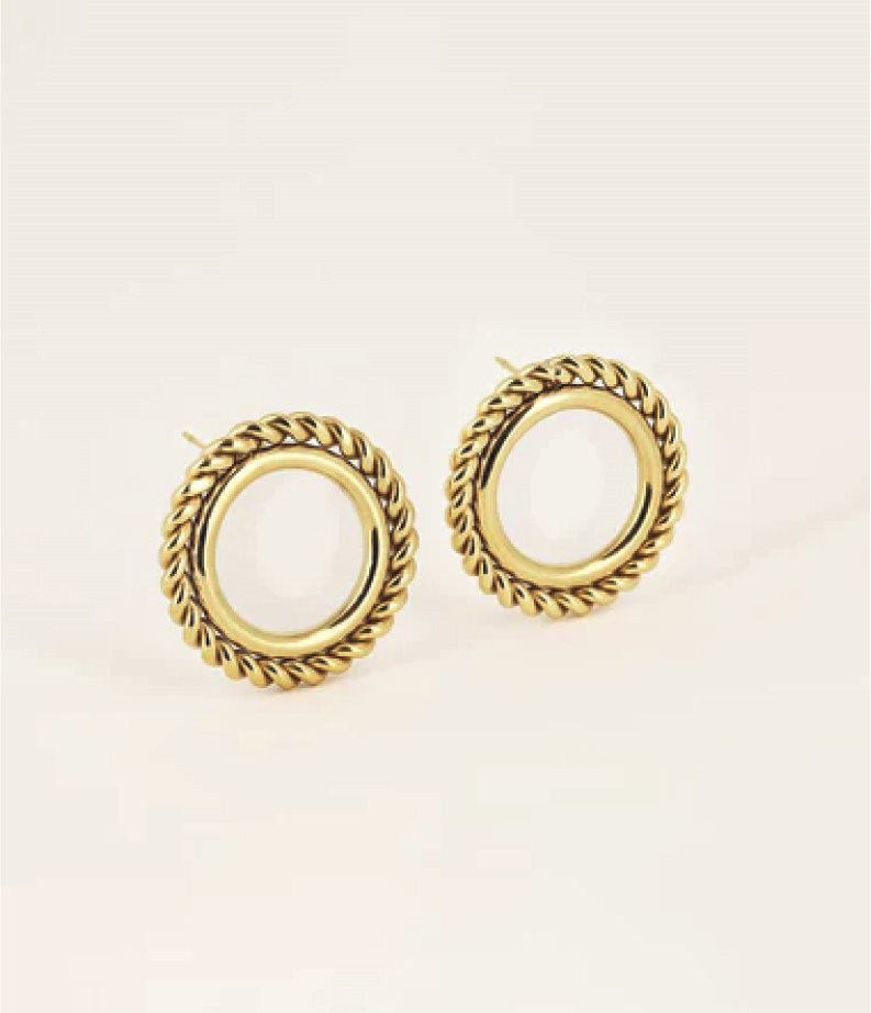 Oorbellen in staal verguld met fijn goud die een gedraaide cirkel rond een ring voorstellen.