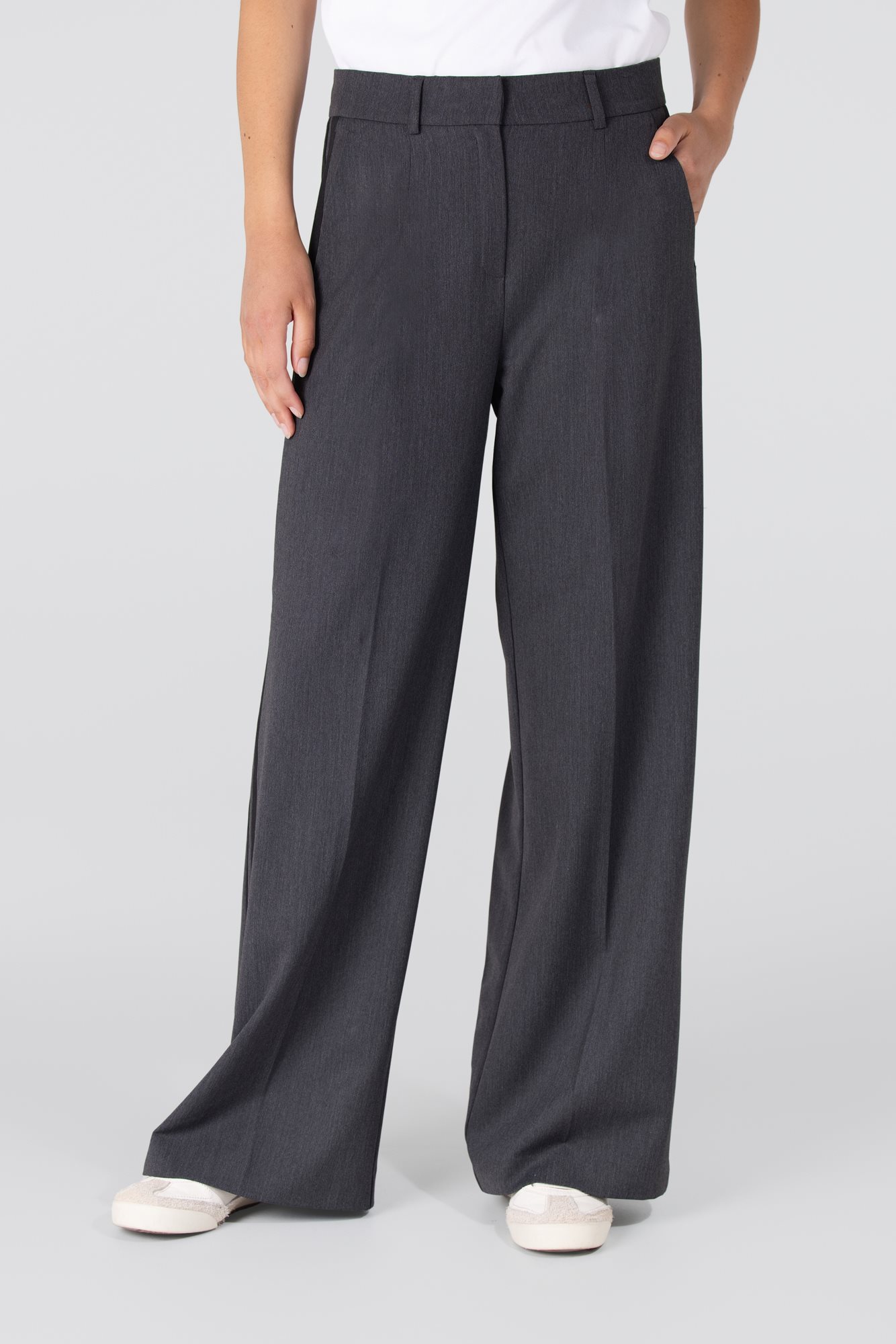 De Bridget pantalon combineert een elegante uitstraling met een comfortabele pasvorm. Deze broek met wijde pijpen is uitgevoerd in zwart en voorzien van een stijlvolle sierbiezen in de zijnaad, wat zorgt voor een subtiel accent. Met steekzakken voor, strookzakken achter en een tailleband met riemlussen is deze broek zowel stijlvol als functioneel. De blinde sluiting zorgt voor een strakke, cleane finish.