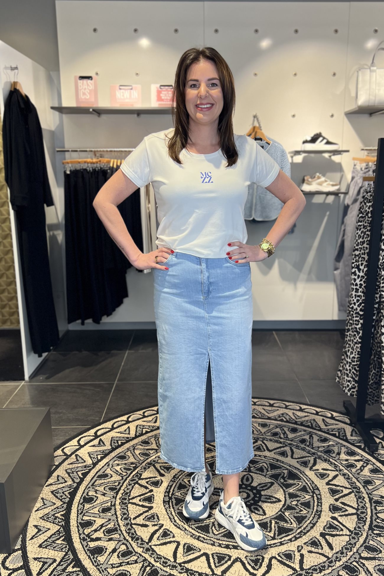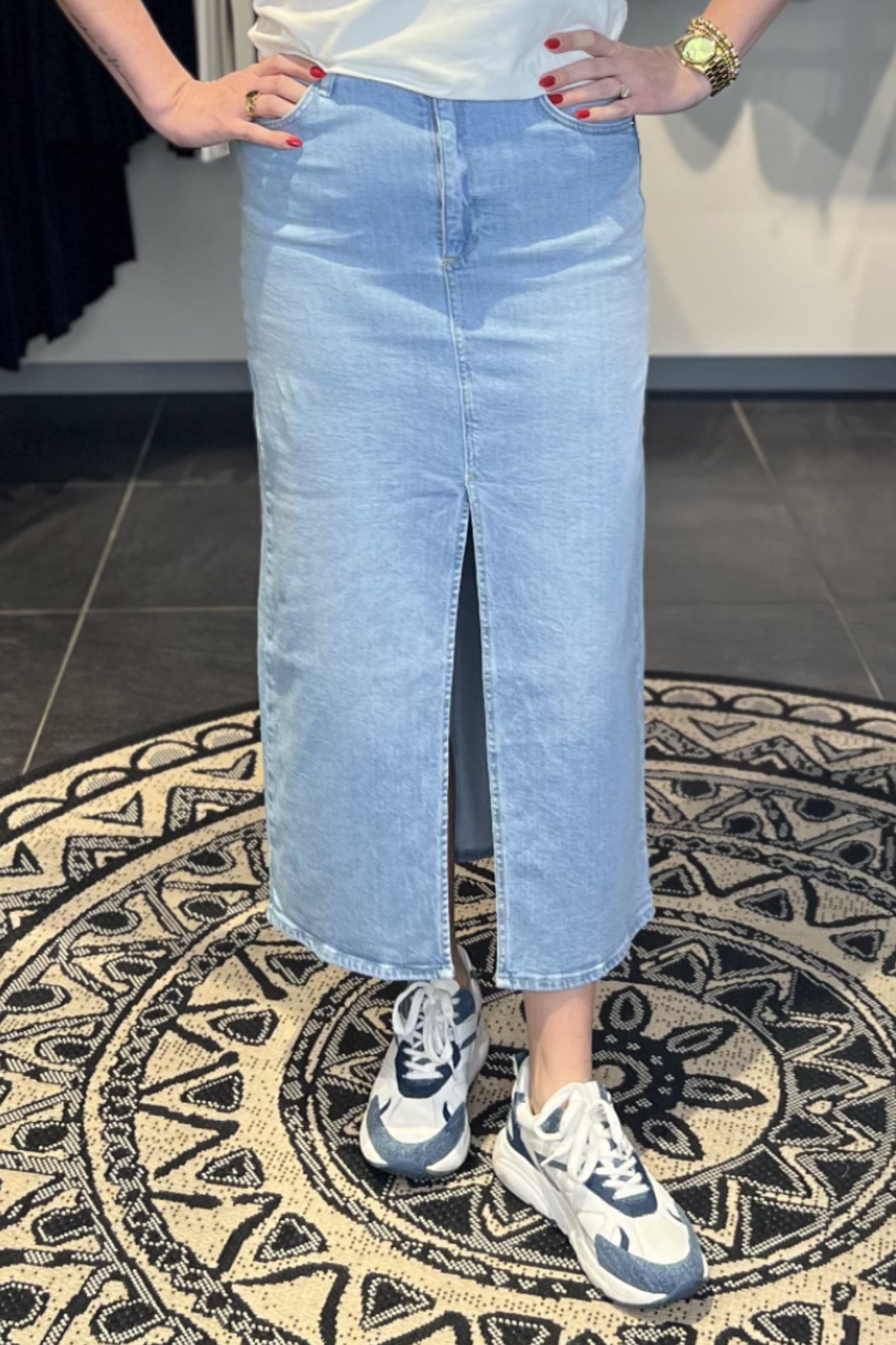 Het hoogtepunt van deze lange rok van LabeL DOT is de diepe split met een symmetrische naad. Het hoogwaardige denim is van stretchkatoen draagt zeer comfortabel. De rok heeft een stijlvol koker-silhouet. Typische denimdetails zijn de dubbele naden, de ritssluiting en het five-pocketdesign.