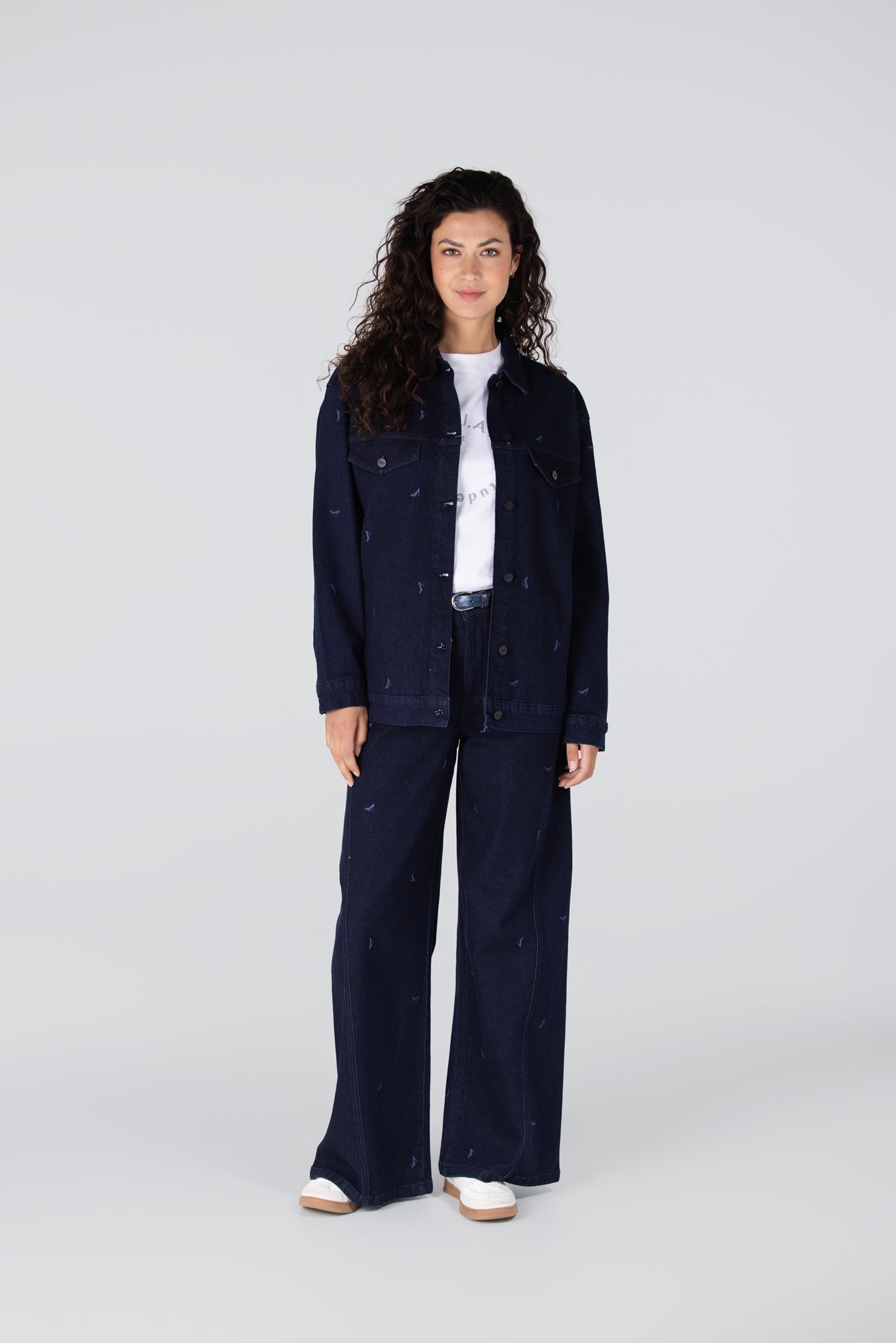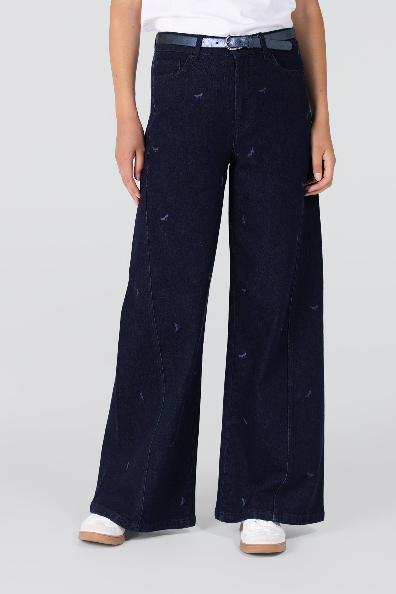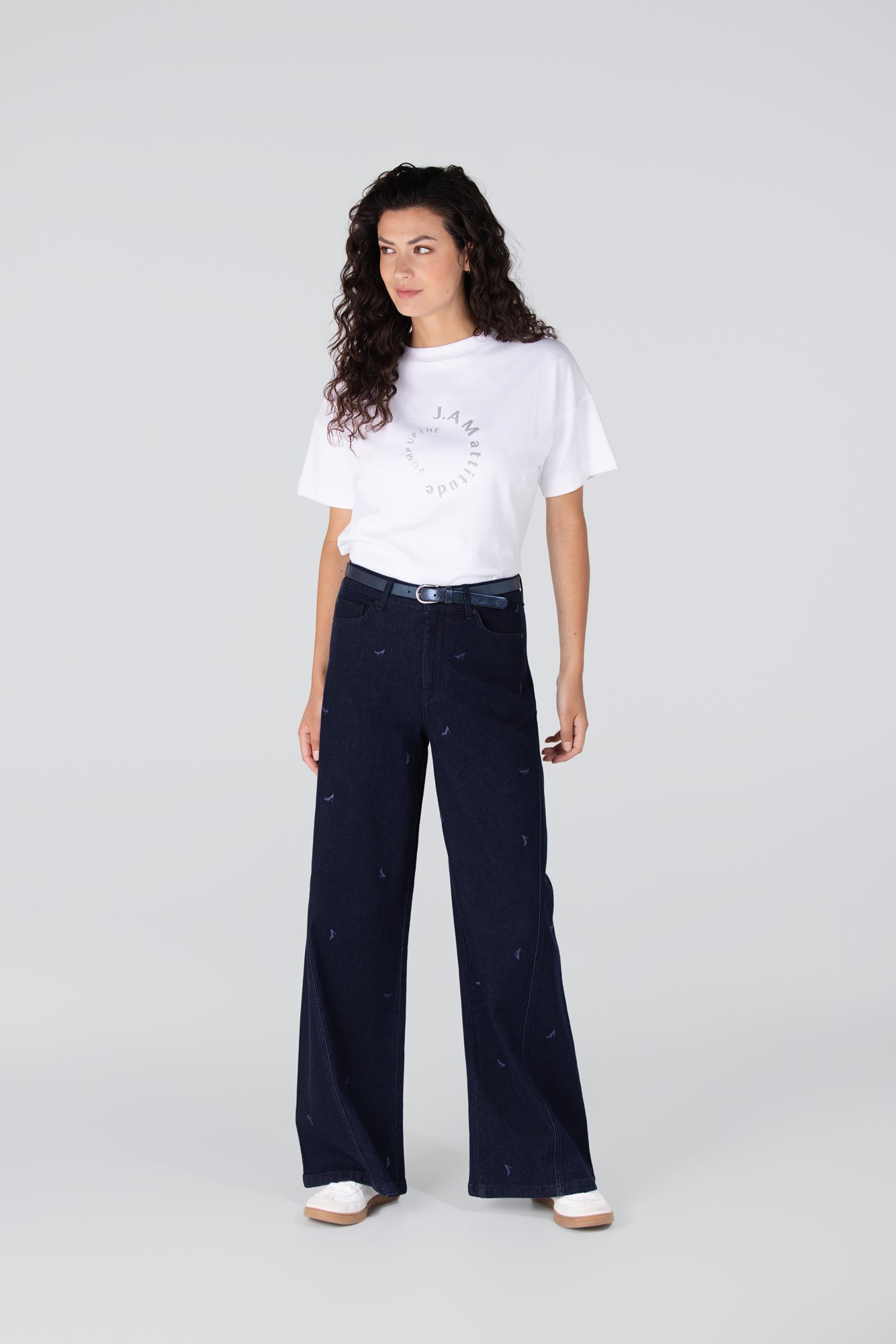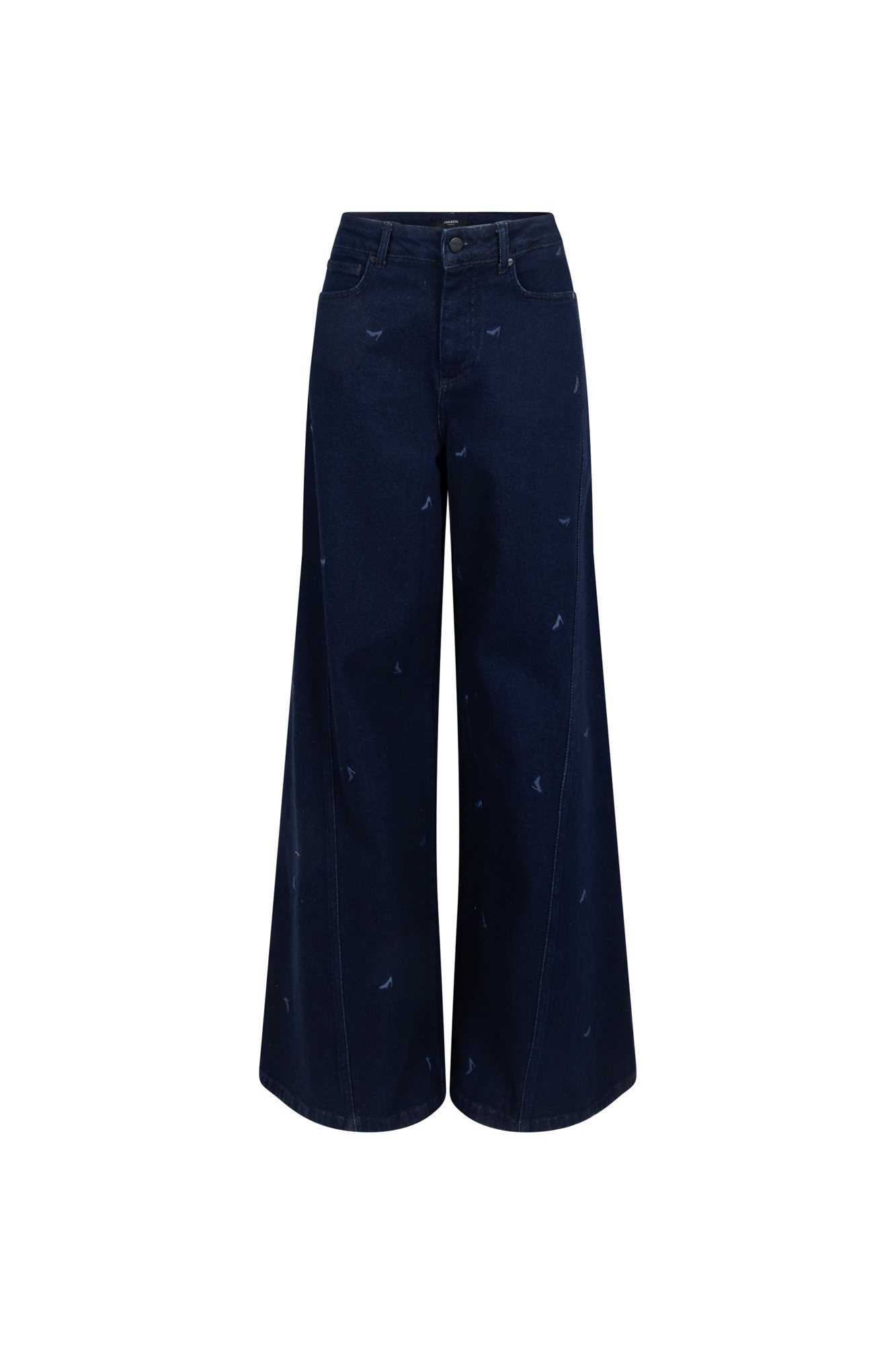 De Isabeau jeans combineert een trendy silhouet met speelse details. Deze wide leg jeans in een diepe donkerblauwe wassing is voorzien van een subtiele all-over borduring van hakjes, wat zorgt voor een unieke en vrouwelijke touch. De schuine decoratieve naad aan de voorzijde creëert een optisch slanker effect. Afgewerkt in een klassieke 5-pocketstijl, is deze broek een eyecatcher met een twist.