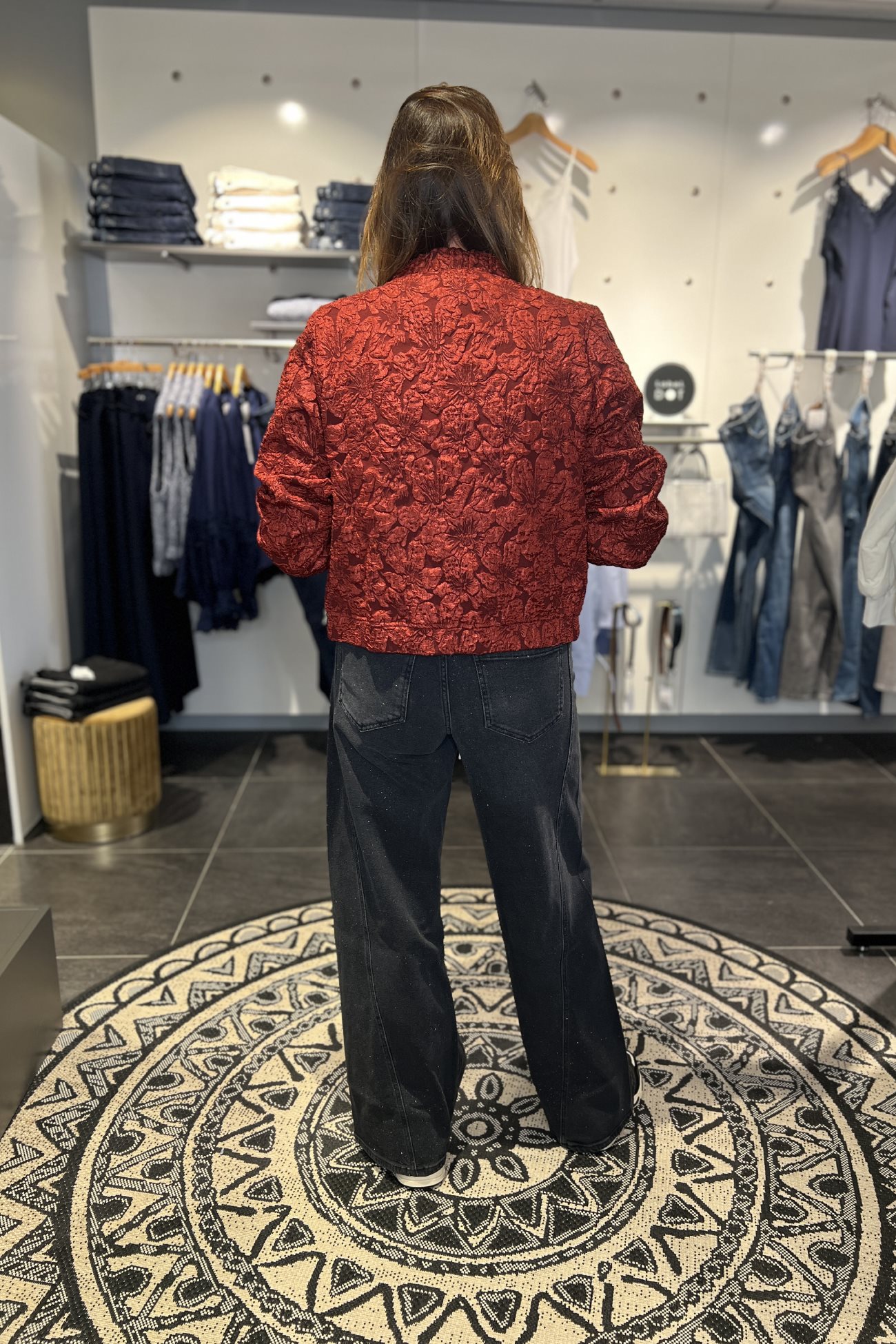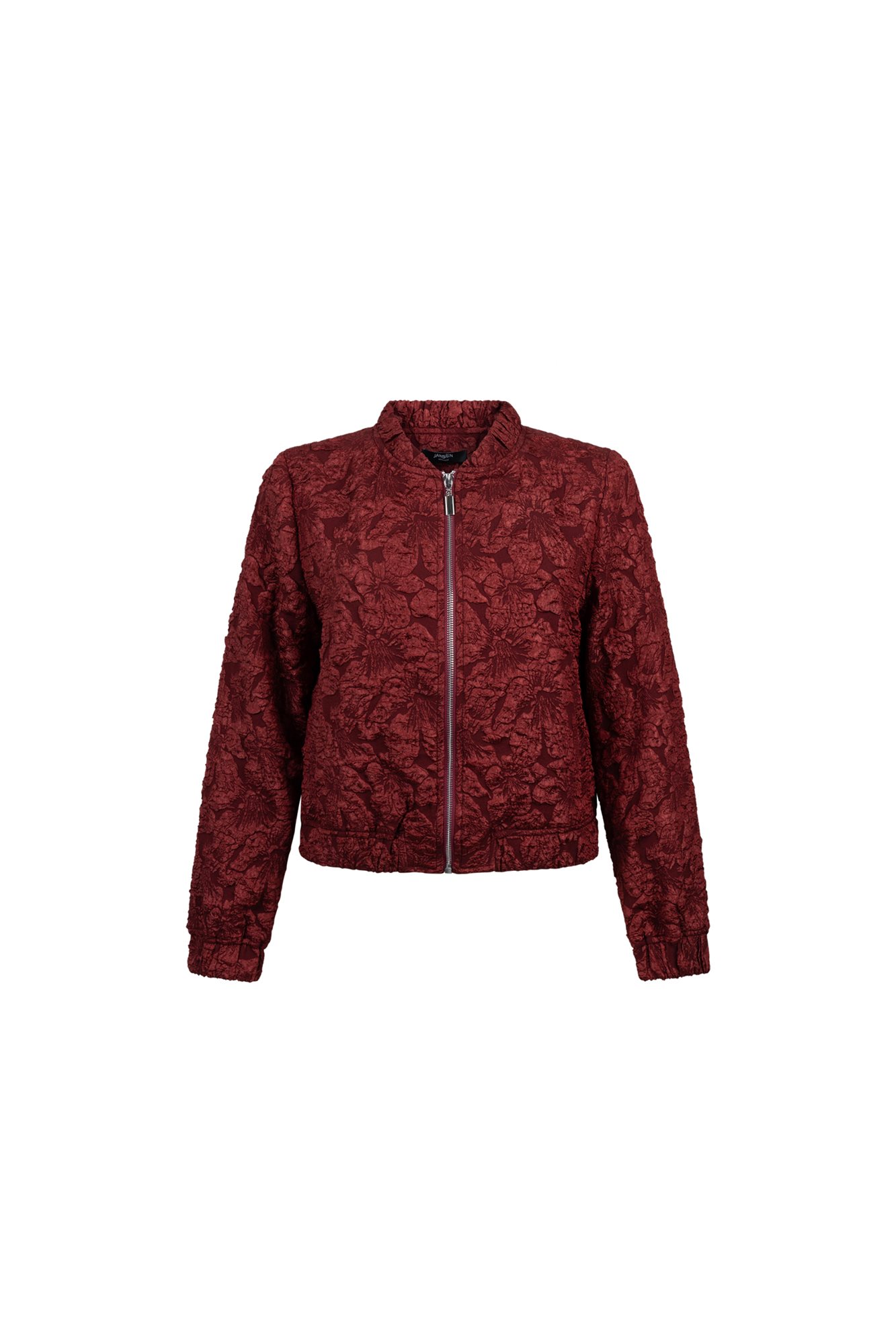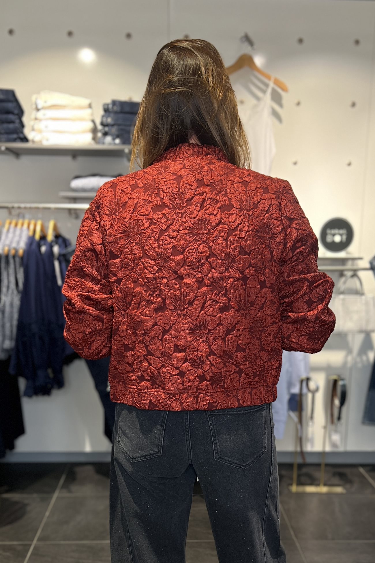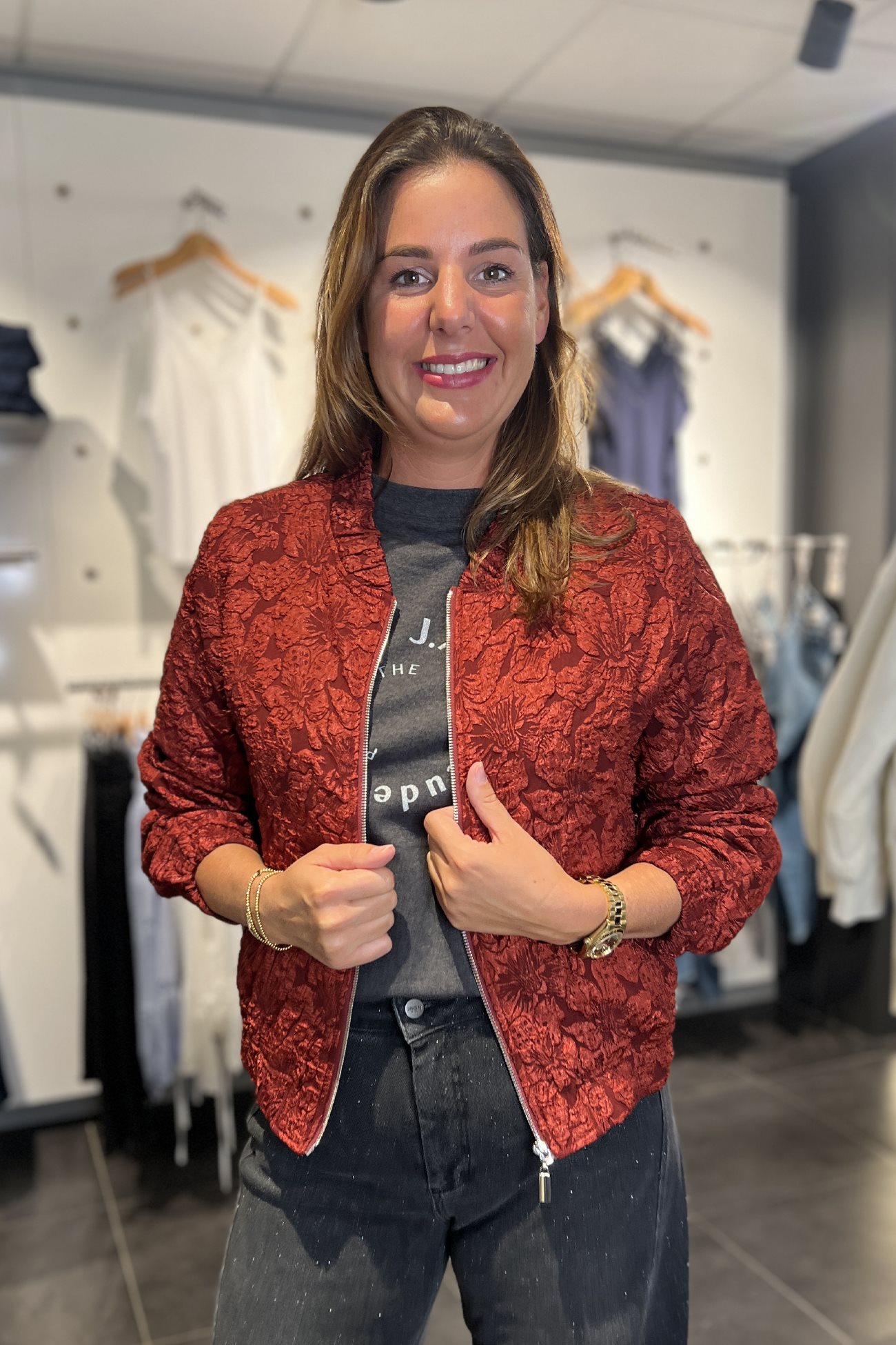 Het Josien bomber jasje is een stijlvolle eyecatcher met een warme cayenne kleur. Het jasje is voorzien van een zilverkleurige metalen ritssluiting aan de voorkant en heeft een klassieke bomber afwerking met kraag, manchetten en zoom van dezelfde stof. Het jacquard bloemenpatroon voegt een verfijnd detail toe, terwijl de praktische strookzakken zorgen voor extra gemak.