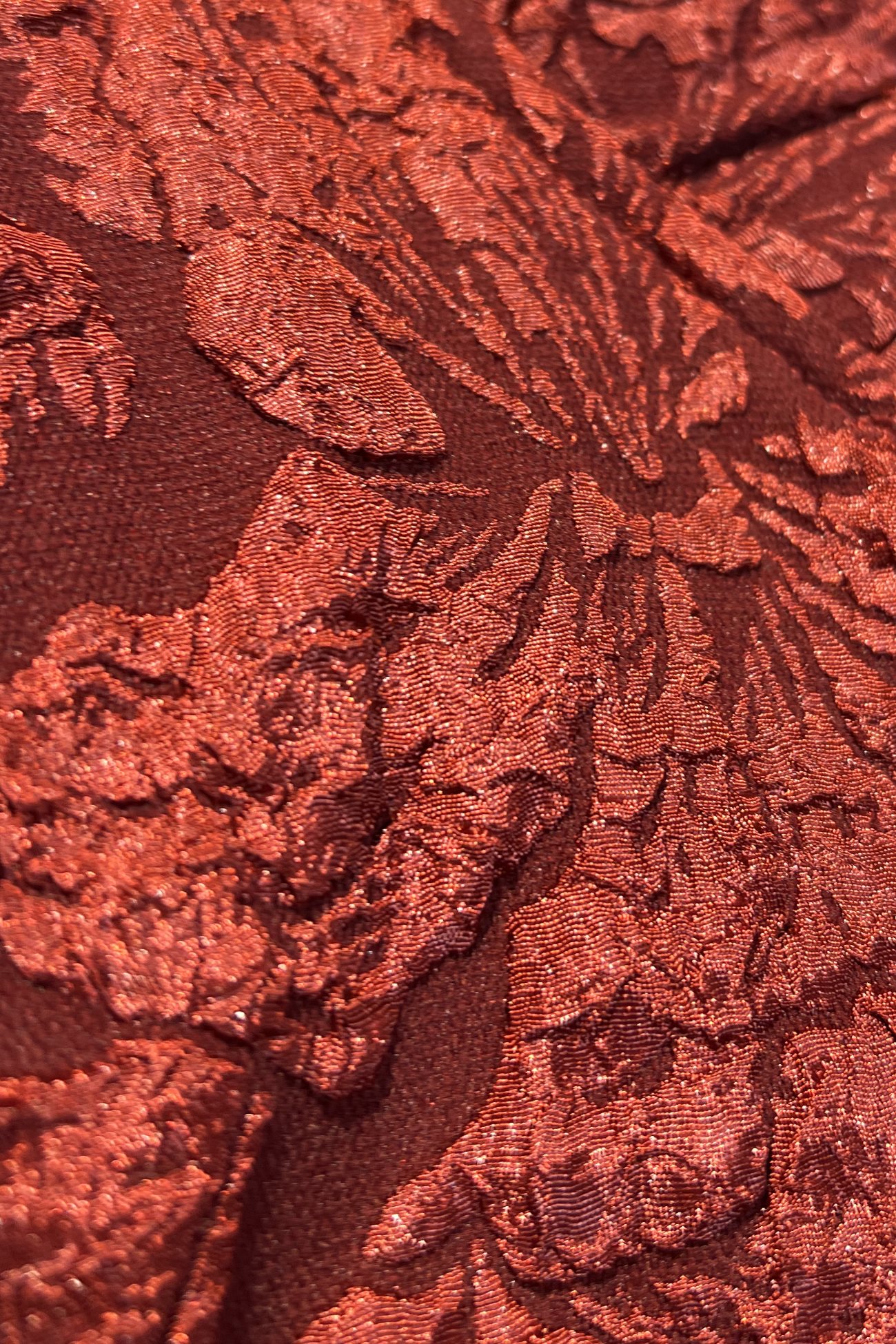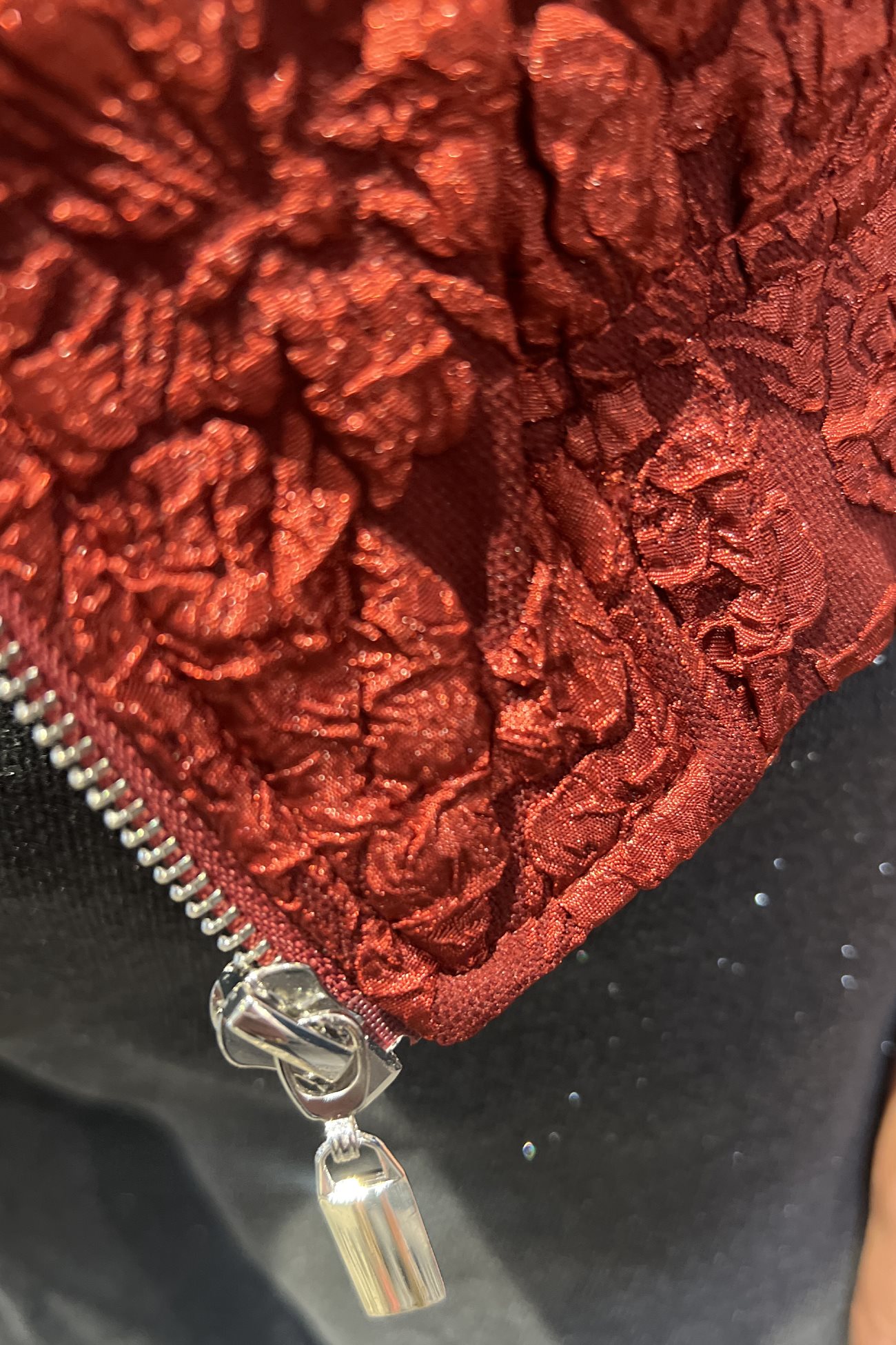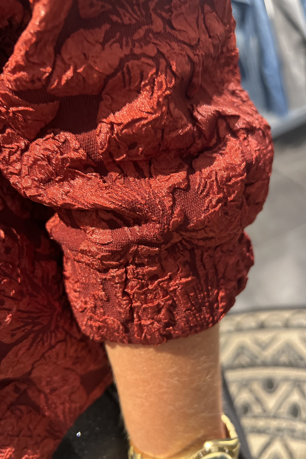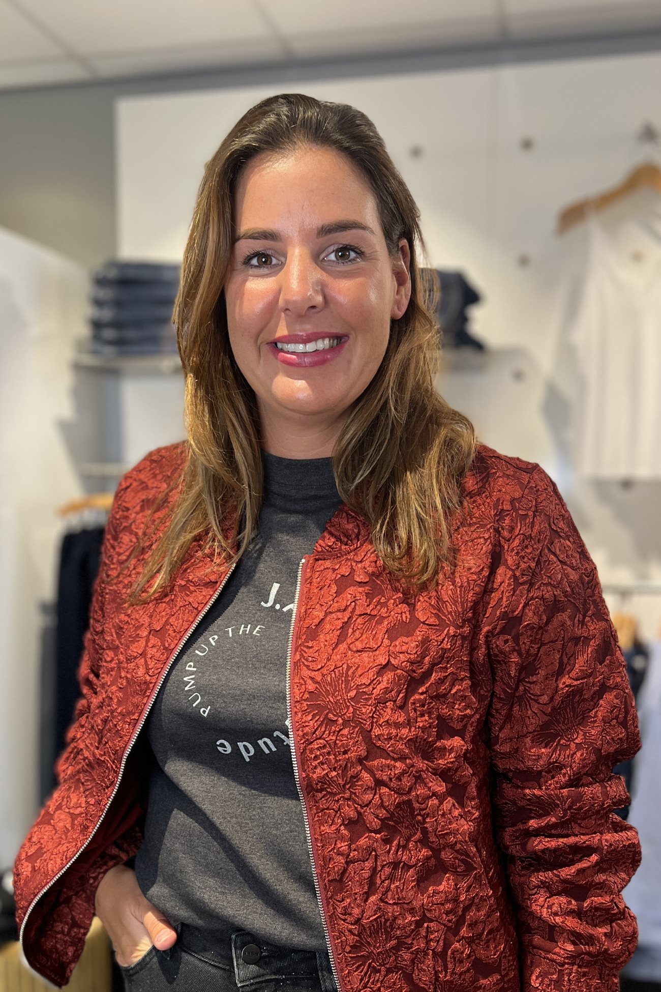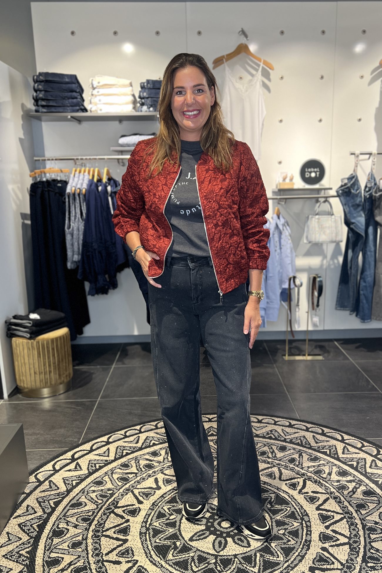Het Josien bomber jasje is een stijlvolle eyecatcher met een warme cayenne kleur. Het jasje is voorzien van een zilverkleurige metalen ritssluiting aan de voorkant en heeft een klassieke bomber afwerking met kraag, manchetten en zoom van dezelfde stof. Het jacquard bloemenpatroon voegt een verfijnd detail toe, terwijl de praktische strookzakken zorgen voor extra gemak.