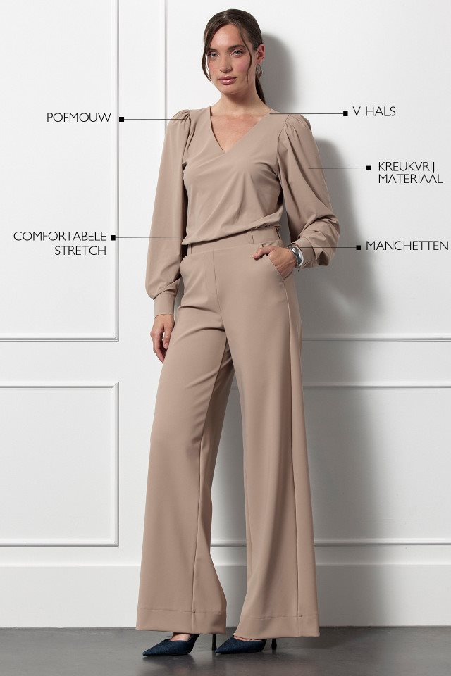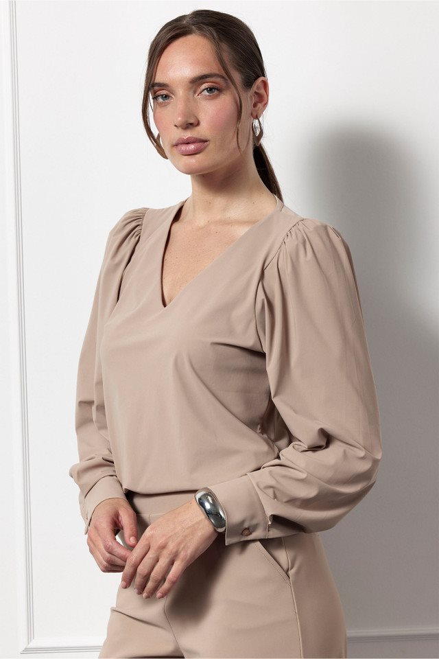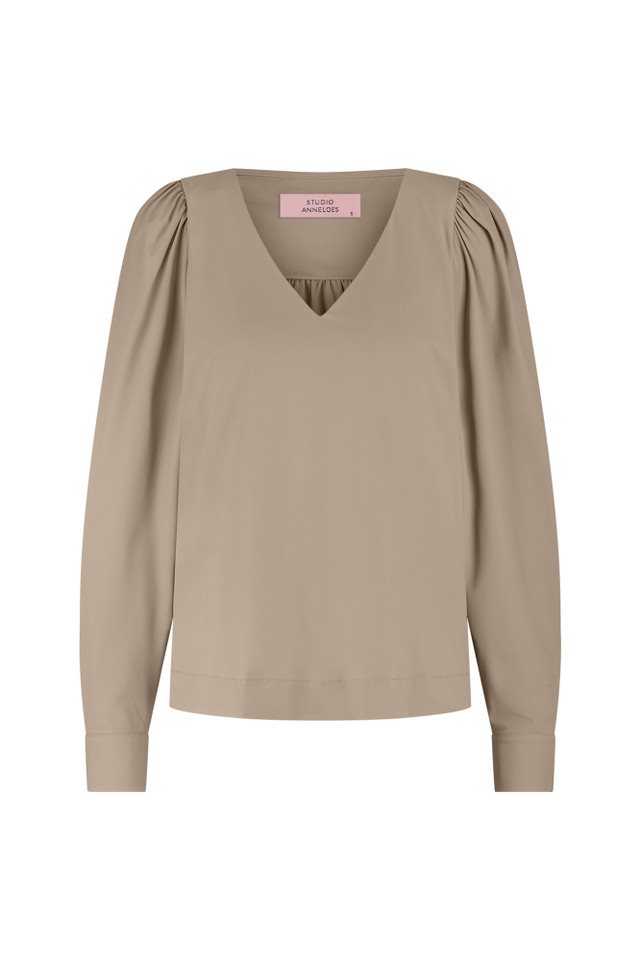 De Les top van Studio Anneloes is een elegante essential die niet mag ontbreken in je garderobe. Deze top in latte heeft een regular fit en is gemaakt van Medium Travelstof, wat zorgt voor een soepele en comfortabele pasvorm. De V-hals geeft een vrouwelijke uitstraling, terwijl de subtiele pofmouwen met manchetten een verfijnde en modieuze touch toevoegen. Perfect voor zowel zakelijke als casual looks.