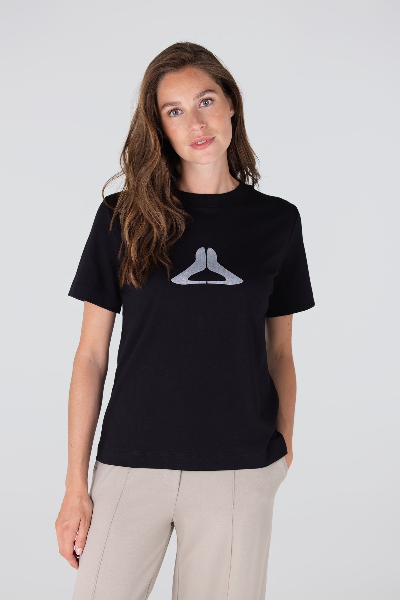 Het Lara T-shirt is een moderne essential met een speelse edge. Dit boxy model in zwart is uitgevoerd met een opvallende zilveren glitter logoprint op het voorpand – een subtiel statement die elke outfit net dat beetje extra geeft. De ronde hals en afhangende schouders zorgen voor een nonchalante, effortless fit. Draag ‘m op een jeans, rok of onder een blazer voor een coole, casual look met een sprankje glamour.